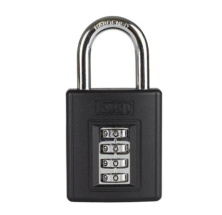 Kasp Combination Padlock. A robust, durable and easy-to-use padlock. It has an ABS Jacket with zinc alloy body and is secured with number dials. The Kasp padlock has a durable hardened 7,6 mm steel shackle and resettable code for extra security, with 10,000 possible combinations.