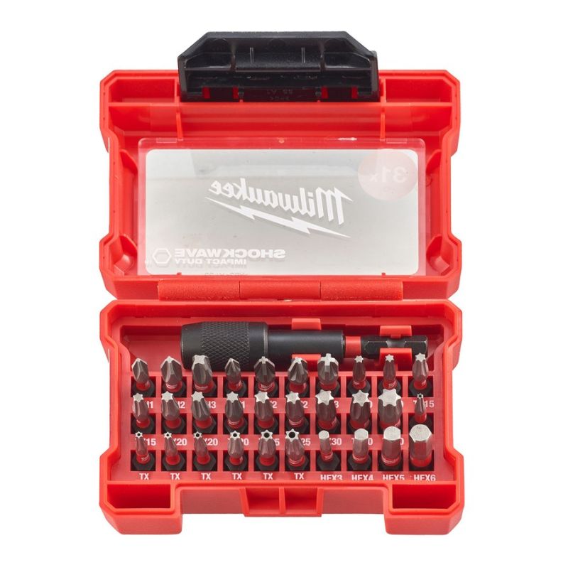 Kit contains. 30 x 25mm (PH1 (1), PH2 (1), PH3 (1), PZ1 (1), PZ2 (2), PZ3 (1), TX10 (2), TX15 (2), TX20 (3), TX25 (2), TX30 (2), TX40 (1), TX BO7 (1), TX BO8 (1), TX BO9 (1), TX BO10 (1), TX BO15 (1), TX BO20 (1), TX BO25 (1), 4 x hex (3, 4, 5 and 6mm)) and 73mm Shockwave locking bit holder.